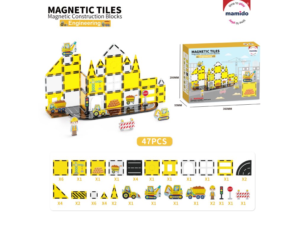 Vydej se do světa dopravy a stavebnictví s originální magnetickou stavebnicí, která se skládá ze 47 dílů. Děti si mohou postavit celé město s cestami, značkami, budovami i vozidly. Barevné magnetické dílky se snadno spojují a umožňují tvořit nekonečné kombinace od jednoduchých staveb až po propracované dopravní scény. Součástí sady jsou také autíčka s podvozkem na kolečkách, dopravní značky, jeřáb a další doplňky, díky nimž hra získává realistický nádech.