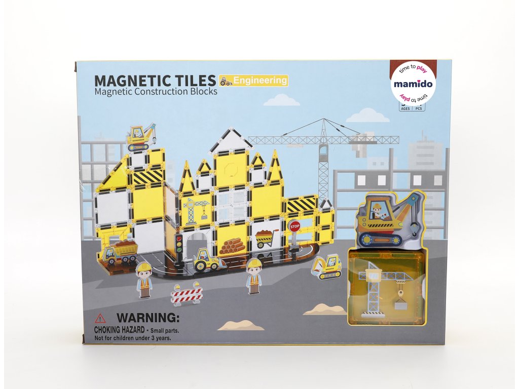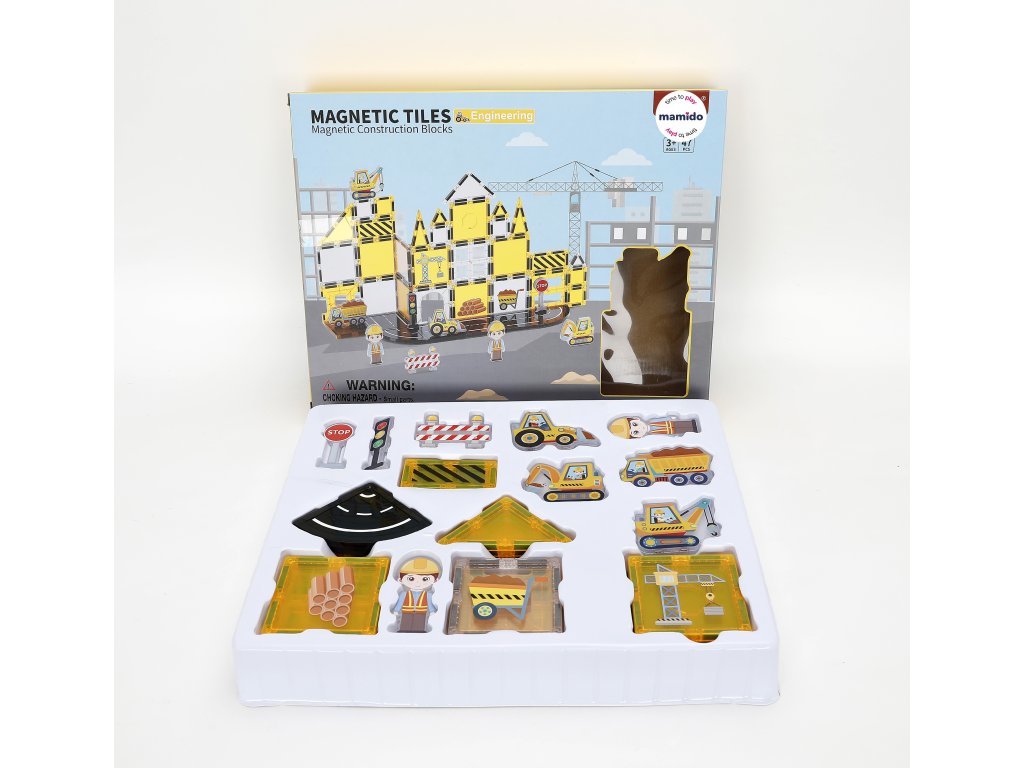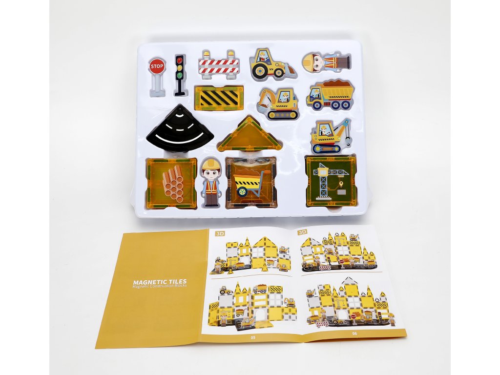 - Obsahuje: magnetické kostky, silniční dílky, dopravní značky, jeřáb, autíčka a další doplňky