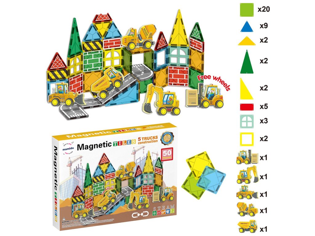 Vydej se do světa dopravy a stavebnictví s originální magnetickou stavebnicí, která se skládá ze 50 dílů. Děti si mohou postavit celé město s cestami, značkami, budovami i vozidly. Barevné magnetické dílky se snadno spojují a umožňují tvořit nekonečné kombinace od jednoduchých staveb až po propracované dopravní scény. Součástí sady jsou také autíčka s podvozkem na kolečkách, dopravní značky, jeřáb a další doplňky, díky nimž hra získává realistický nádech.