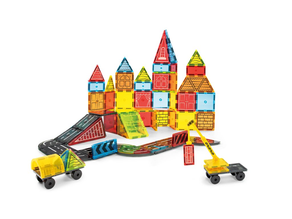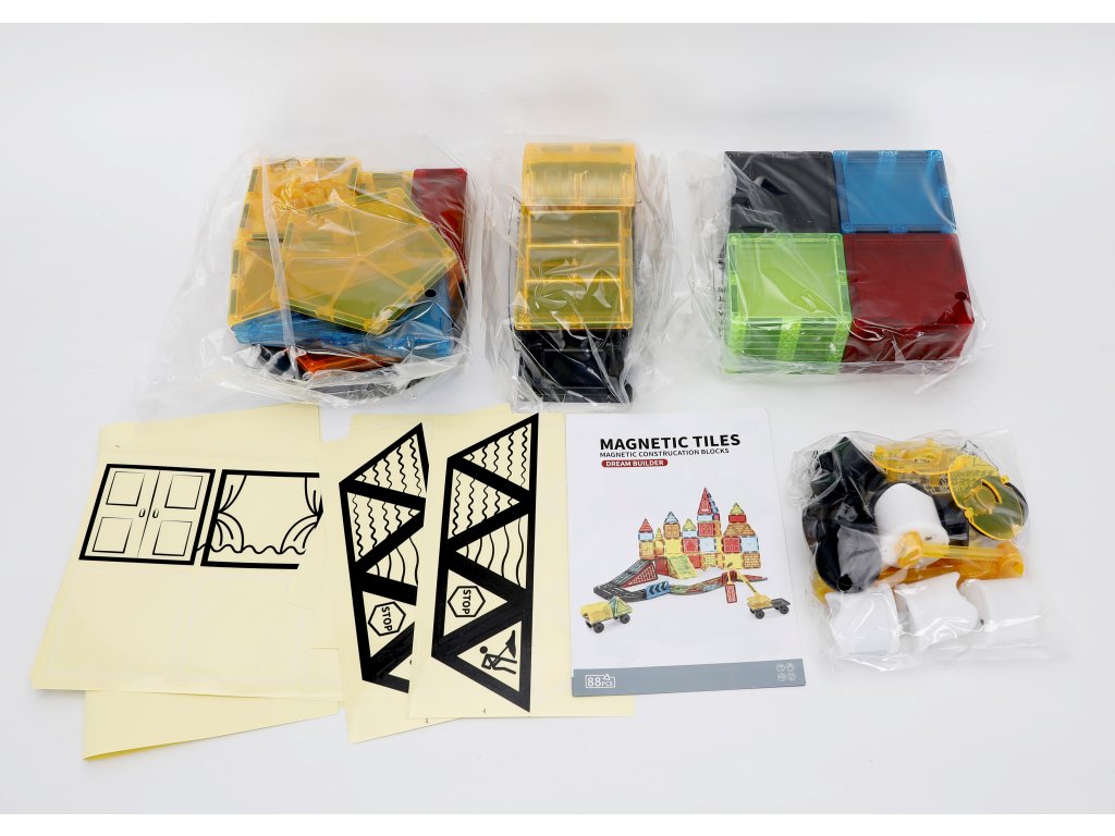 - Obsahuje: magnetické kostky, silniční dílky, dopravní značky, autíčka a další doplňky