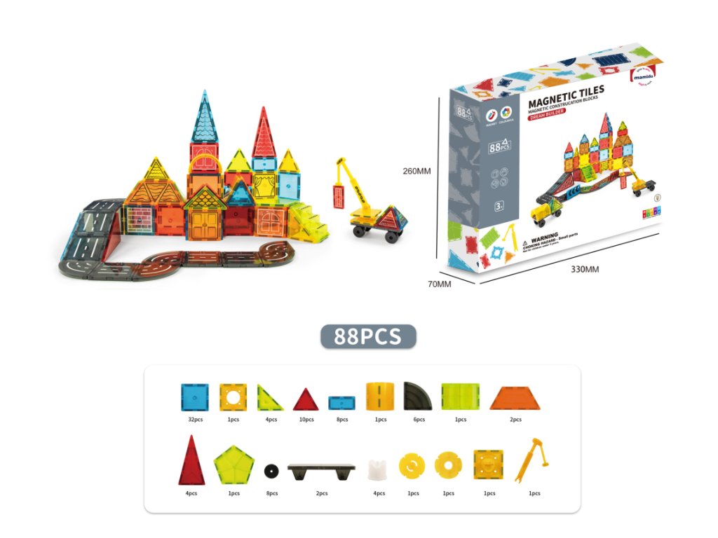 Vydej se do světa dopravy a stavebnictví s originální magnetickou stavebnicí, která se skládá ze 88 dílů. Děti si mohou postavit celé město s cestami, značkami, budovami i vozidly. Barevné magnetické dílky se snadno spojují a umožňují tvořit nekonečné kombinace od jednoduchých staveb až po propracované dopravní scény. Součástí sady jsou také autíčka s podvozkem na kolečkách, dopravní značky, jeřáb a další doplňky, díky nimž hra získává realistický nádech.