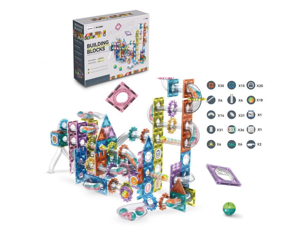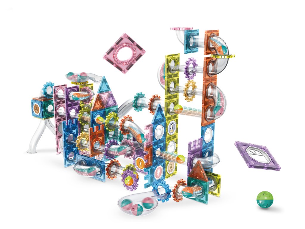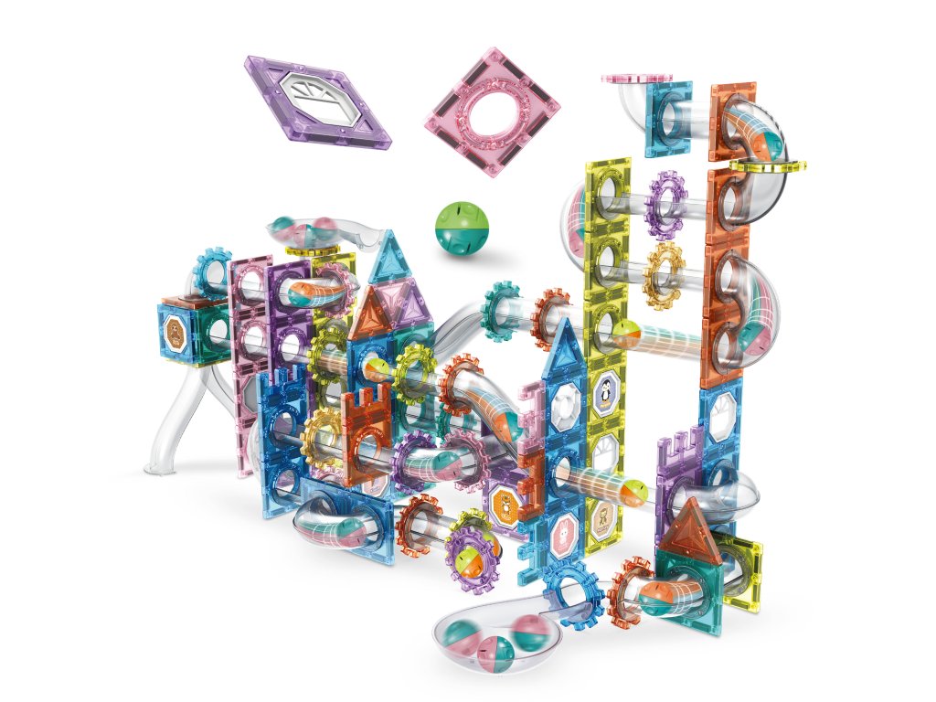 Prvky stavebnice mají silné magnety, které zajišťují stabilitu i u vyšších staveb. Díky bohaté škále dílků – čtverců, trojúhelníků, kol, dlouhých tunelů i rotačních prvků – si děti mohou stavět dráhy plné zatáček, průjezdů a spirál. Tato stavebnice skvěle rozvíjí logiku, kreativitu a jemnou motoriku.