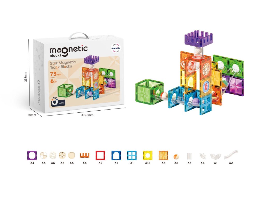 Objevte svět fantazie a fyziky s barevnou magnetickou stavebnicí Star Magnetic Track Blocks. Tato sada obsahuje 73 dílů, které umožňují stavět originální kuličkové dráhy plné zatáček, tunelů a průjezdů.