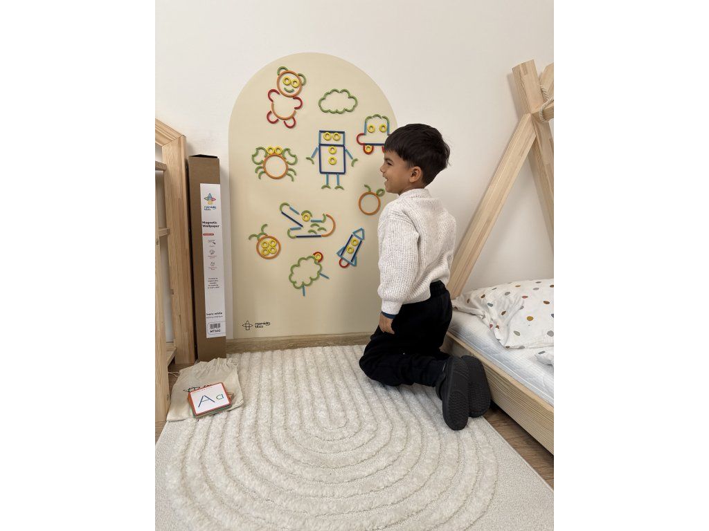 Magnetická tapeta Mamido Tiles přinese dětem ještě více zábavy, tvoření a učení díky magnetické síle a snadné instalaci. Stačí ji nalepit na hladkou stěnu a během okamžiku vznikne interaktivní prostor pro magnetky, kreslení křídou, malování omyvatelnými barvami i psaní fixem na tabule.