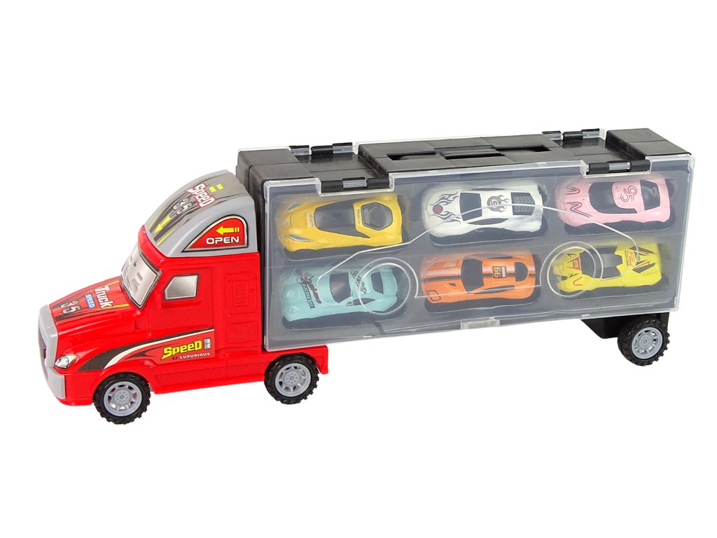 Červený náklaďák s přívěsem, který pojme až 6 autíček. Průhledné boky návěsu se otevírají, aby bylo možné umístit menší autíčka do speciálních přihrádek - boxů - takže je lze přepravovat kamkoli.