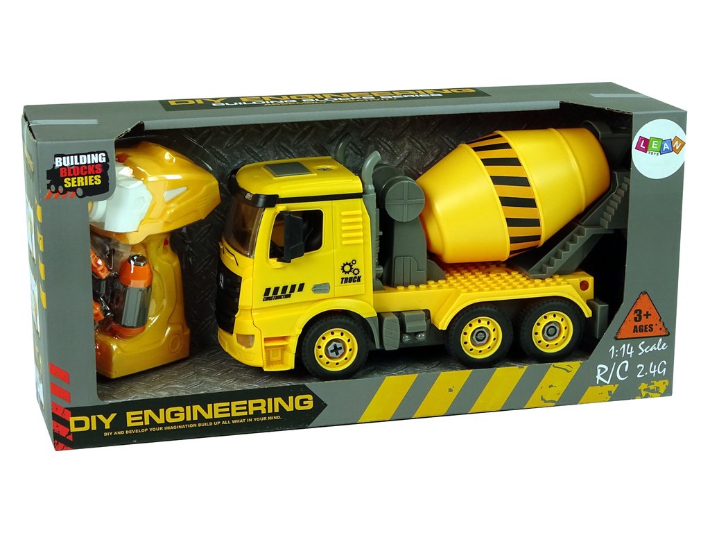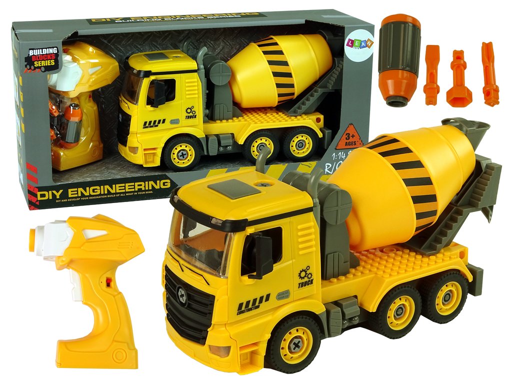Největší výhodou setu je možnost dálkového ovládání. Motor obsažený v sadě má dvě funkce. Montáží na šroubovák vám umožní pohrát si s jeho rozebíráním a instalací do míchačky betonu jej můžete ovládat. Přiložený dálkový ovladač ve tvaru šroubováku pracuje na frekvenci 2,4 GHz a umožňuje jízdu vpřed/vzad. Sada je vyrobena v měřítku 1:14, žlutá a šedá.