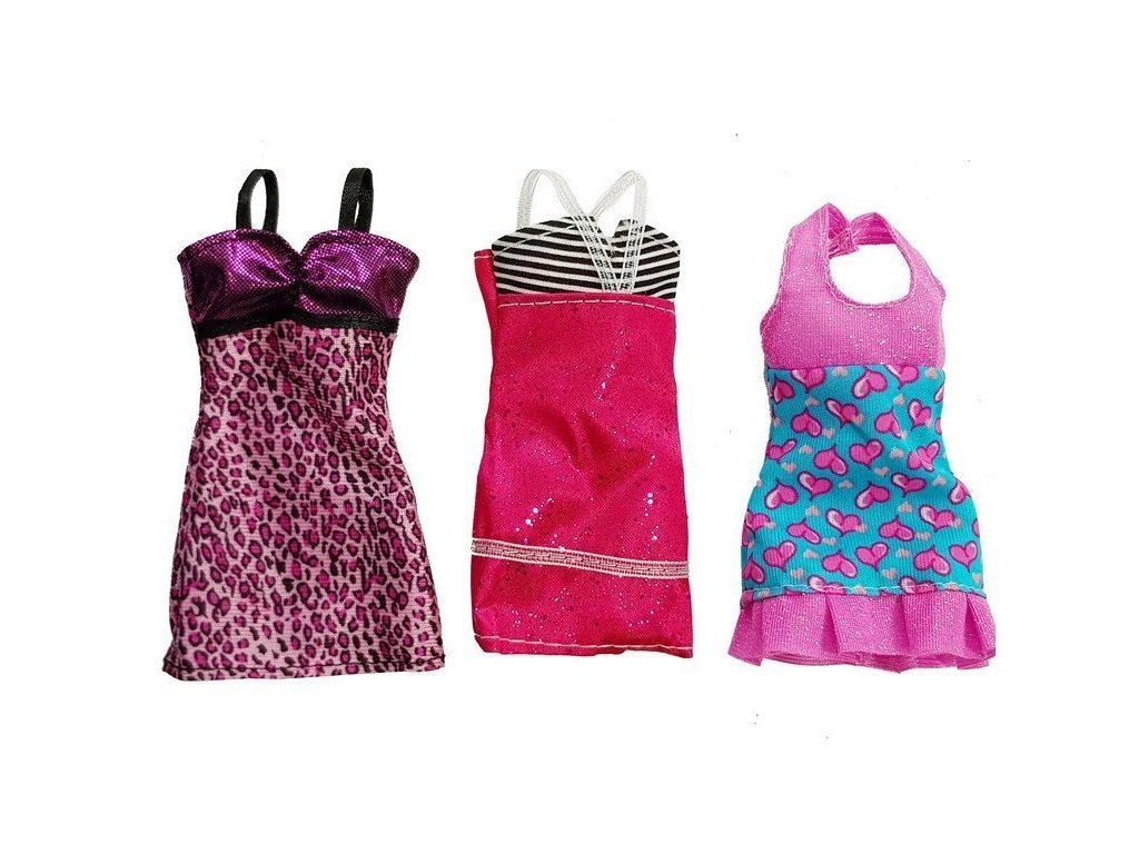 - 4 šaty (stříbrné, růžové s leopardím vzorem, růžové se srdíčky, růžové s černobílými pruhy)
