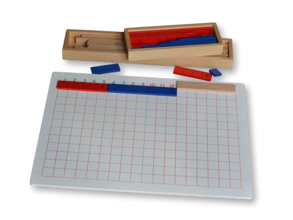 - 9 modrých proužků délky 1–9 čtverců, na každém proužku je červeně napsané odpovídající číslo.