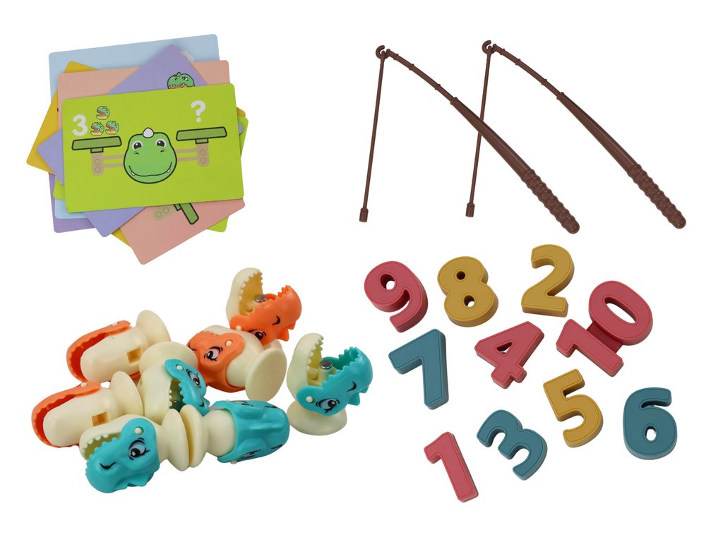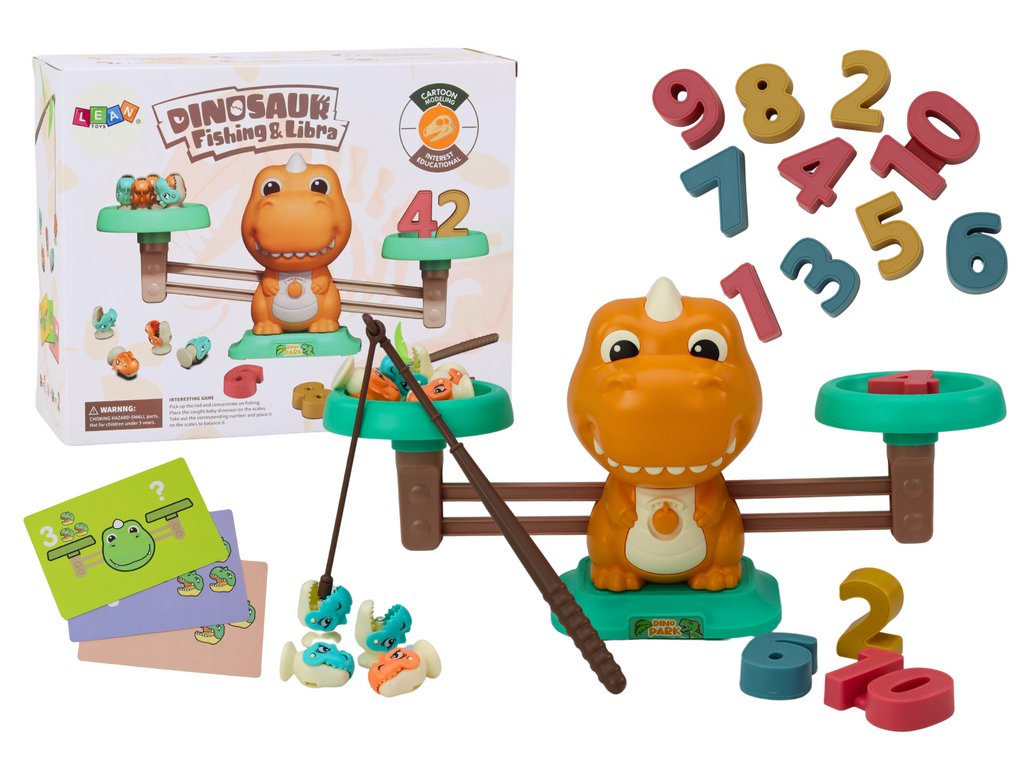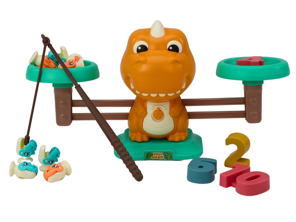 Aby děti vyvážily váhu, musí umístit správný počet dinosaurů na jednu misku, což reprezentuje výsledek rovnice, a na druhou misku umístit správný počet závaží ve tvaru dinosaurů, což reprezentuje číslo – výsledek.
