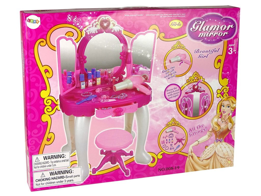 Kosmetický stoleček je skvělá hračka pro malé slečny. Na stolečku se nachází zrcadlo, kde je na vrchu rámu umístěné srdíčko, které má zvukové a svítící funkce.