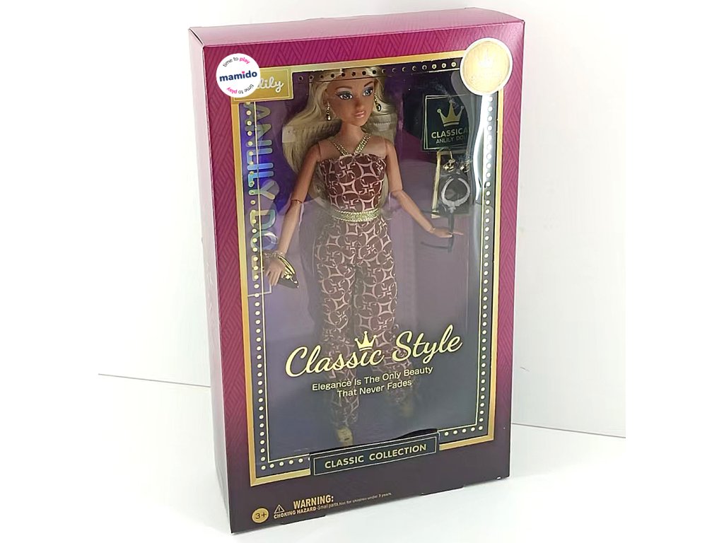 Objev kouzlo elegance s panenkou Anlily Classic Style ve velikosti 29 cm. Panenka s hnědou pletí je oblečena do moderního overalu s originálním vzorem, zlatým páskem a stylovými doplňky. Součástí balení je kabelka a sada šperků, které dodají hře nádech luxusu a kreativity. Perfektní volba pro malé milovnice módy a sběratelky.