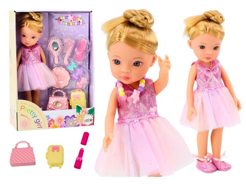 Loutka je oblečená v elegantní růžové baletní sukni, která září a upoutá pozornost. Nese klasické balerínky vázané na noze, což jí dodává autentický vzhled skutečné baleríny. Loutka má dlouhé blond vlasy upravené do vysokého drdolu, který podtrhuje její baletní styl. Má jemný make-up a barevný náhrdelník, které jí dodávají půvab a eleganci. Stylová kabelka je ideální na drobné příslušenství loutky. Funkční kufr, který si loutka může vzít na své baletní cesty. Sponky, které lze použít k úpravě vlasů loutky. Malý prstýnek, který loutce přidává eleganci. Zrcátko, kartáč a praktické zrcadlo, které umožňuje loutce kontrolovat svůj vzhled před baletními vystoupeními.