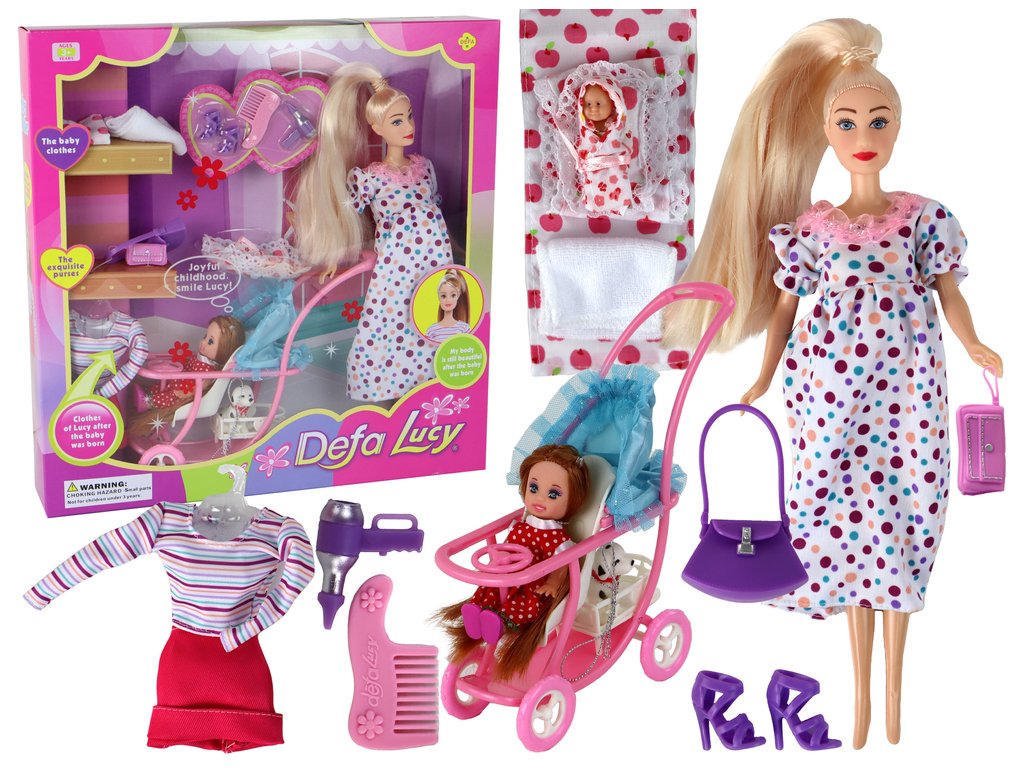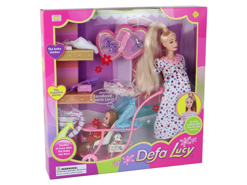Set obsahuje kromě panenky Lucy a jejích těhotenských šatiček i druhé dítě, které je starší, má dlouhé hnědé vlásky a je oblečené v rozkošných červených šatičkách s bílými puntíky. Ve speciálním košíku pod kočárkem je bílý pejsek s černými skvrnami a červenou mašličkou.