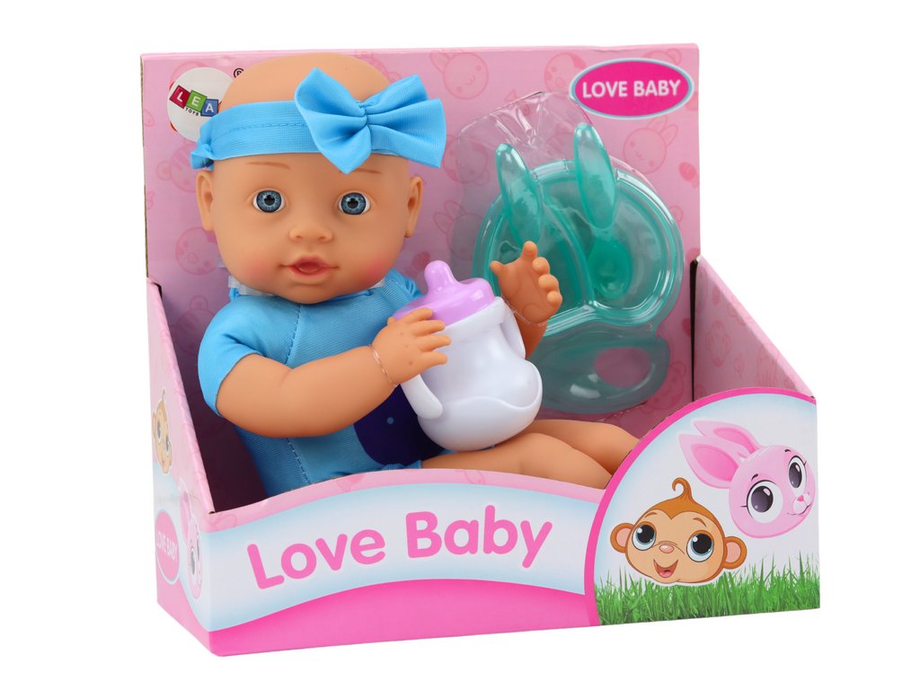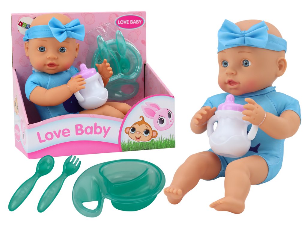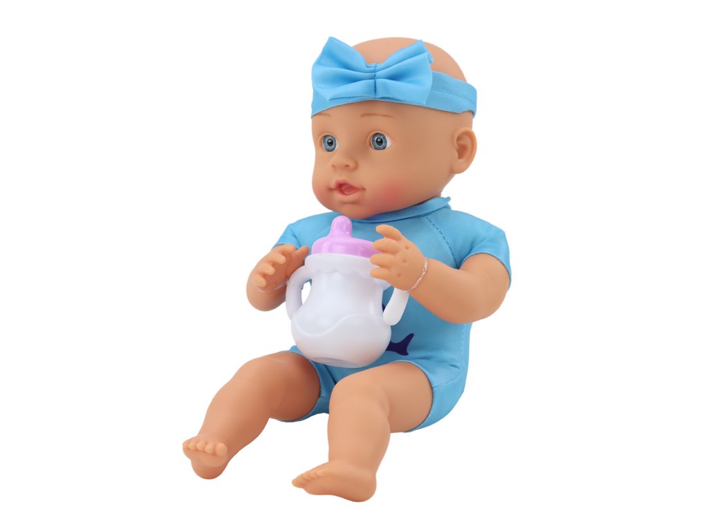 Roztomilá panenka miminko! V modrém oblečku s motivem velryby a krásnou modrou čelenkou s mašlí tato panenka vyzařuje čistý půvab a sladkost. Sada obsahuje nejen tuto roztomilou panenku, ale i praktické příslušenství, jako je mistička s lžičkou a vidličkou a lahvička.