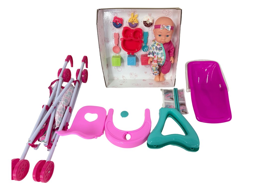Velký dárkový set pro malé pečovatelky! Panenka o velikosti 30 cm přichází s bohatou výbavou, která zahrnuje kočárek, jídelní židličku, nosítko/lehátko a množství zábavných doplňků. Ideální pro hraní na maminku a rozvíjení fantazie.