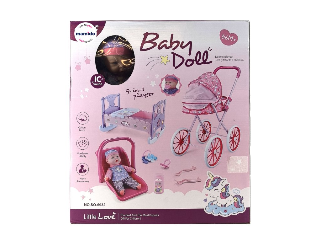 Panenka miminko s vybavením 9v1 - panenka, kočárek, postýlka, autosedačka a doplňky