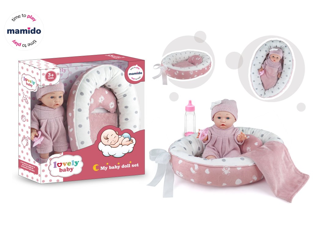 Roztomilá panenka miminko s hnízdečkem je jako stvořená pro všechny malé maminky. Miminko je oblečené do růžového oblečku s čelenkou a součástí balení je také hnízdečko na spaní, lahvička, dudlík a dečka.