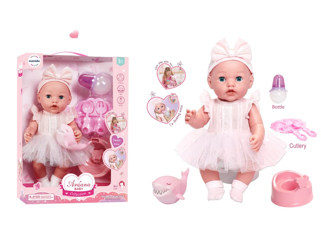 Miminko v růžových šatičkách přináší dětem svět něžné péče, her na rodinu a rozvíjení představivosti. Panenka má jemné rysy, měkké tělíčko a díky své velikosti 30,5 cm se skvěle drží i menším dětem. Součástí balení je bohatá sada doplňků, která umožní krmení, přebalování i hraní – nechybí lahvička, nočník, sada příborů ani roztomilá hračka ve tvaru žralůčka.