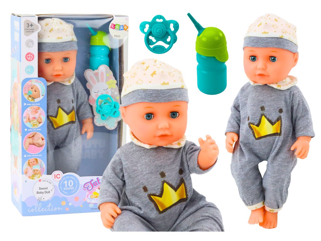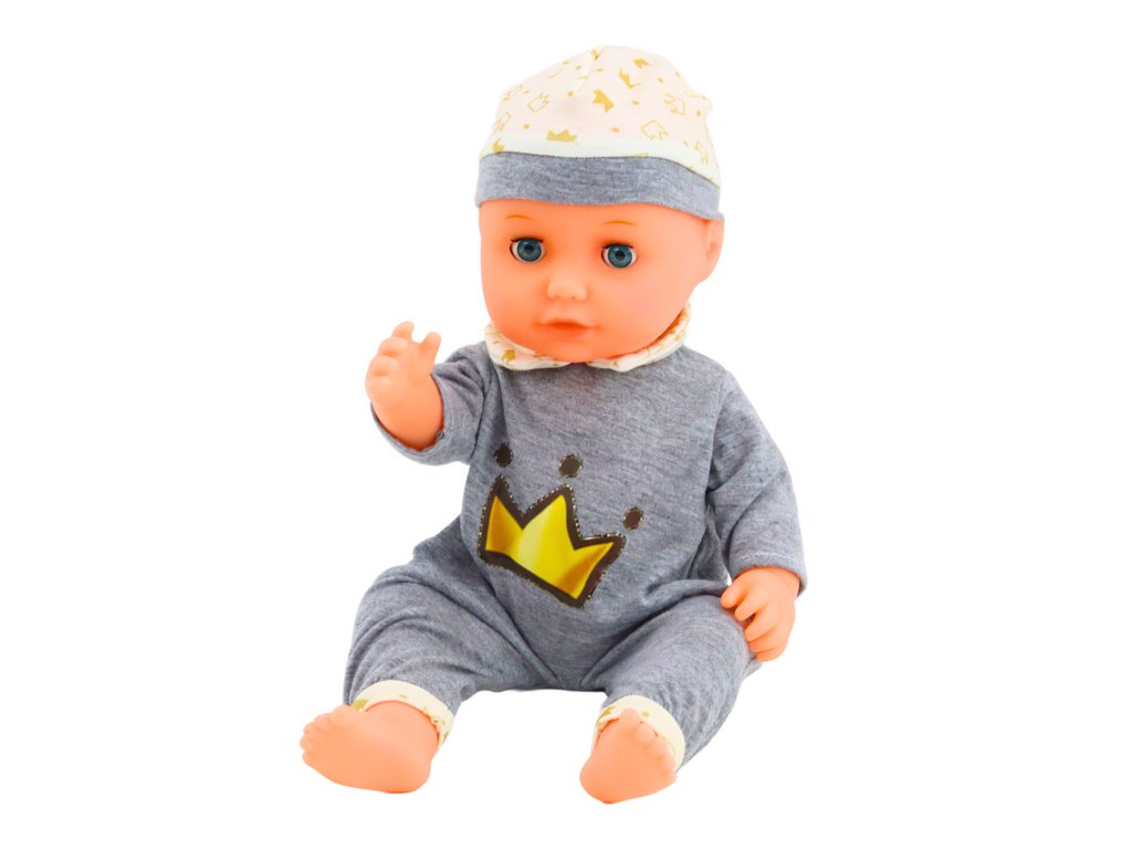 Okouzlující panenka v šedém pyžámku s barevnými motivy zlaté koruny se stane oblíbenou hračkou každého dítěte. Měkké pyžamko a čepička, pohyblivé končetiny a hlavička umožňují realistickou hru a nastavování panenky do různých pozic.