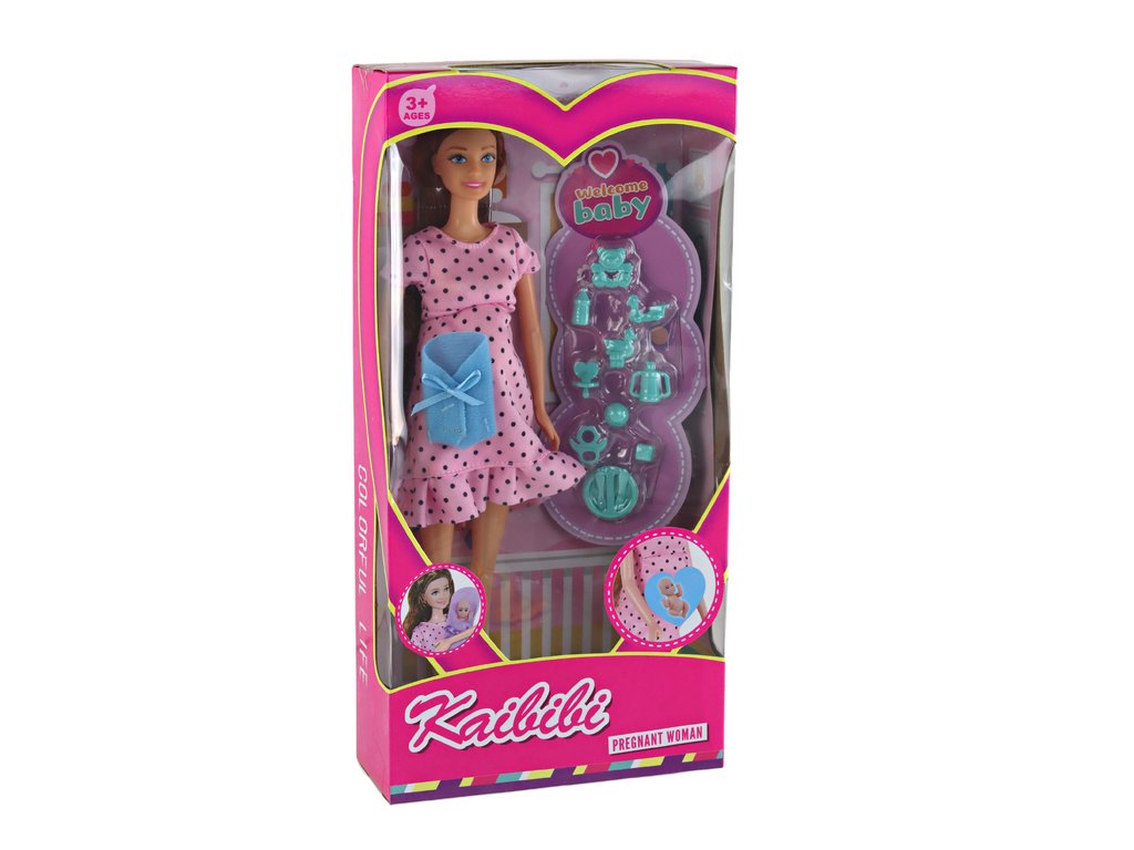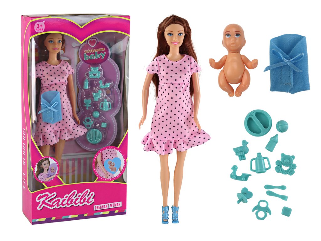 Fascinující těhotná panenka, která potěší malé milovníky kreativní hry a péče. Panenka má hnědé vlasy a modré oči, které dodávají její elegantnímu vzhledu dojemnost. Nosí růžové šaty s černými puntíky a modré lodičky na podpatku, čímž tvoří stylový look.