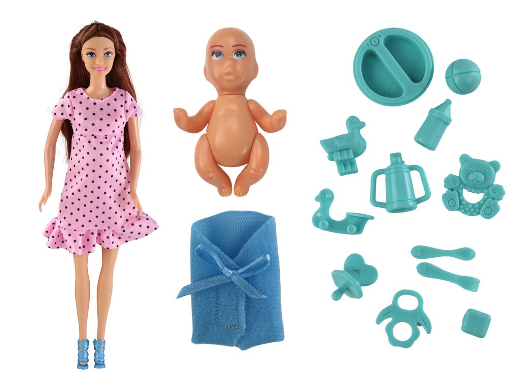 Těhotná panenka s miminkem v růžových šatech s příslušenstvím