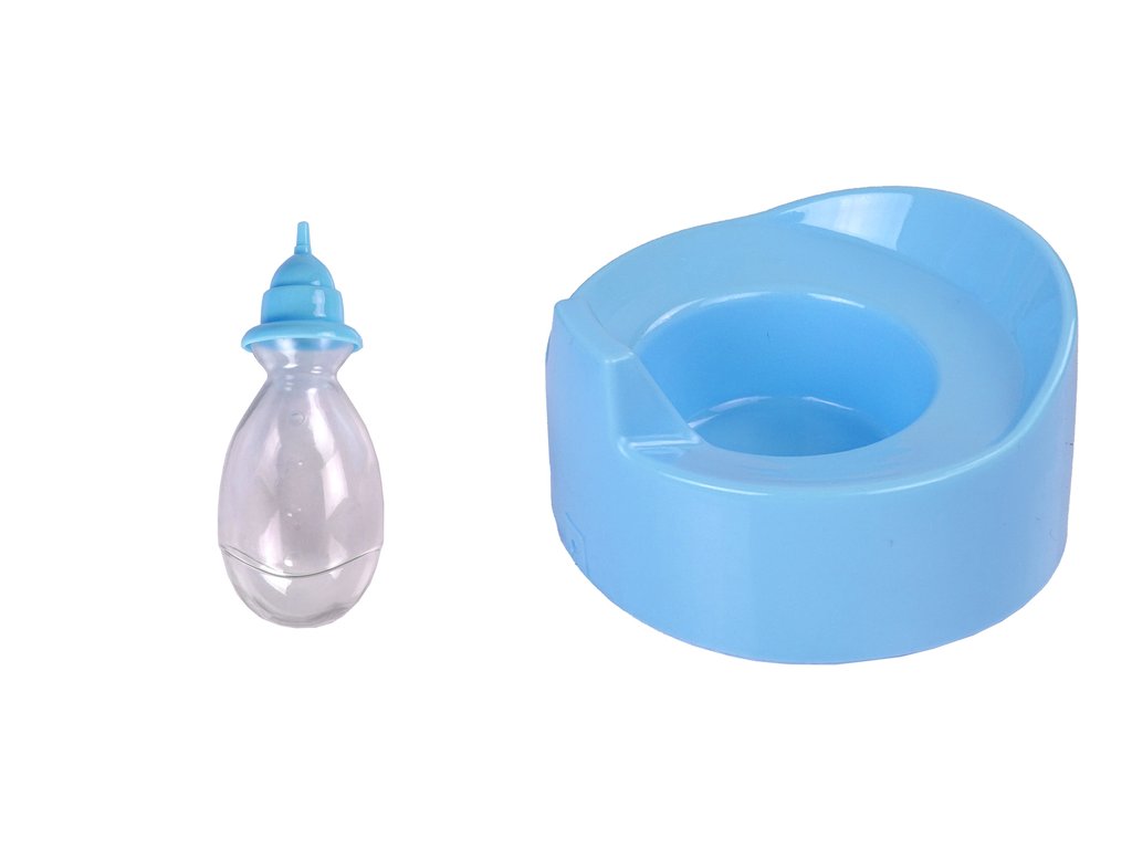 Součástí sady je lahvička a nočník. Panenka může pít a čůrat stejně jako skutečné dítě.