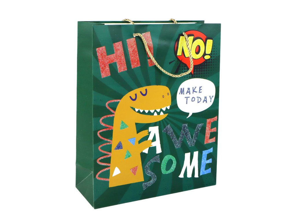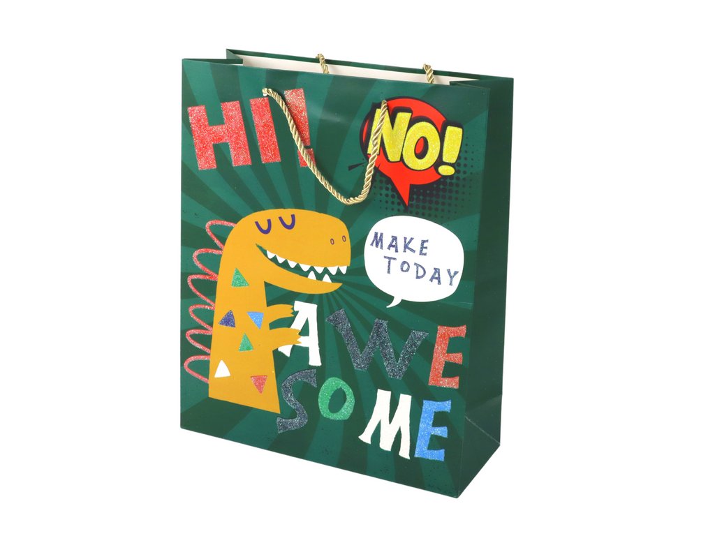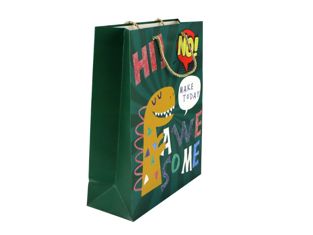 Papírová dárková taška zelený dinosaurus o rozměrech 41,5 cm x 30 cm x 12 cm přináší do vašeho dárku zábavný prvek v podobě roztomilého dinosaura s jemným flitrem.