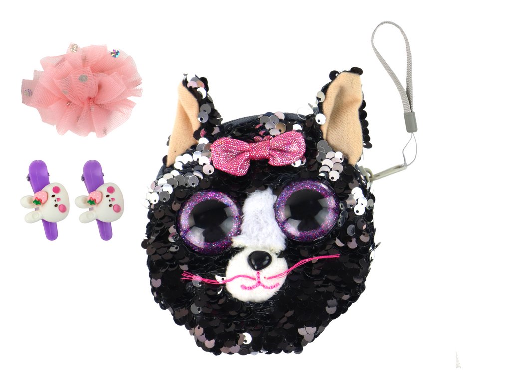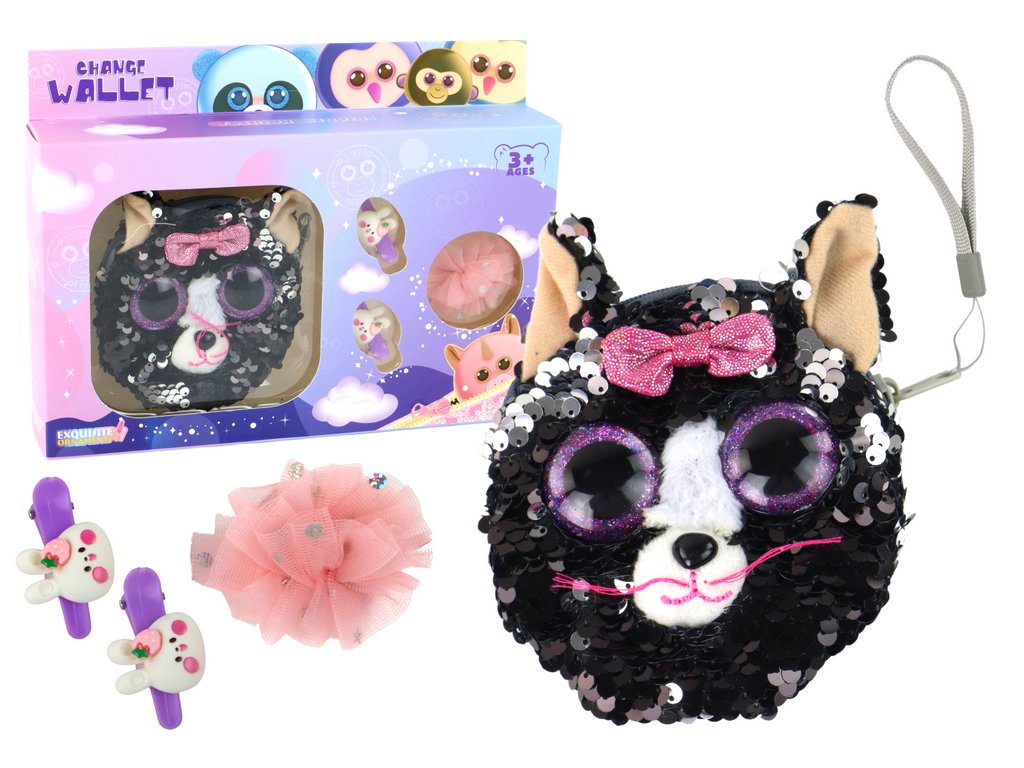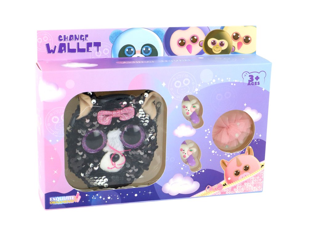 Tato peněženka a sponky jsou roztomilým doplňkem, který jistě okouzlí každou malou slečnu svým půvabem a jemností. Hlavním prvkem je peněženka ve tvaru roztomilého kocourka, vyrobena z lesklých flitrů dodávajících jí magický lesk. Modré oči paní pandy dodávají setu ještě větší půvab.