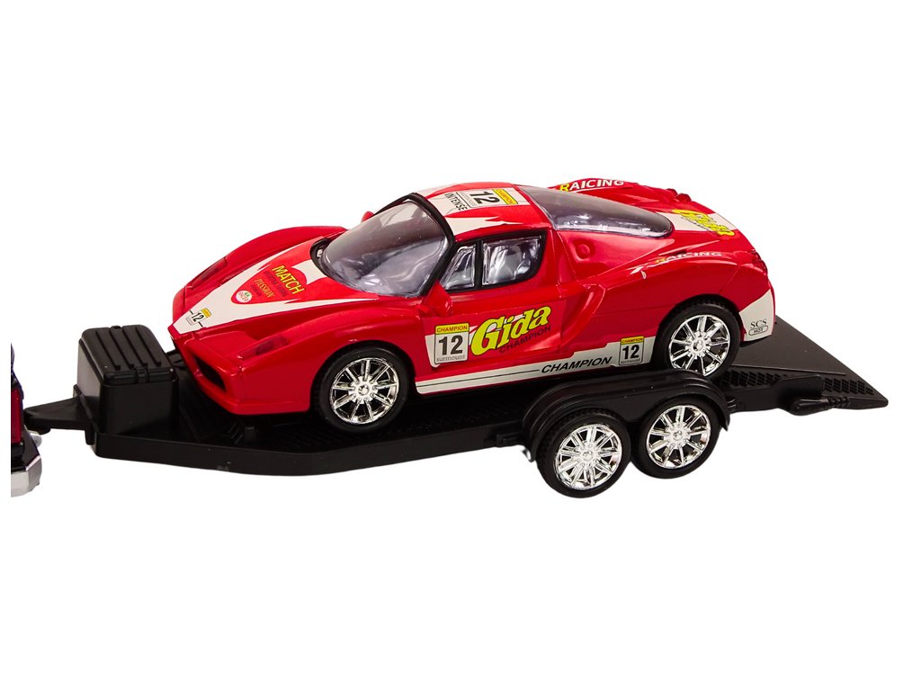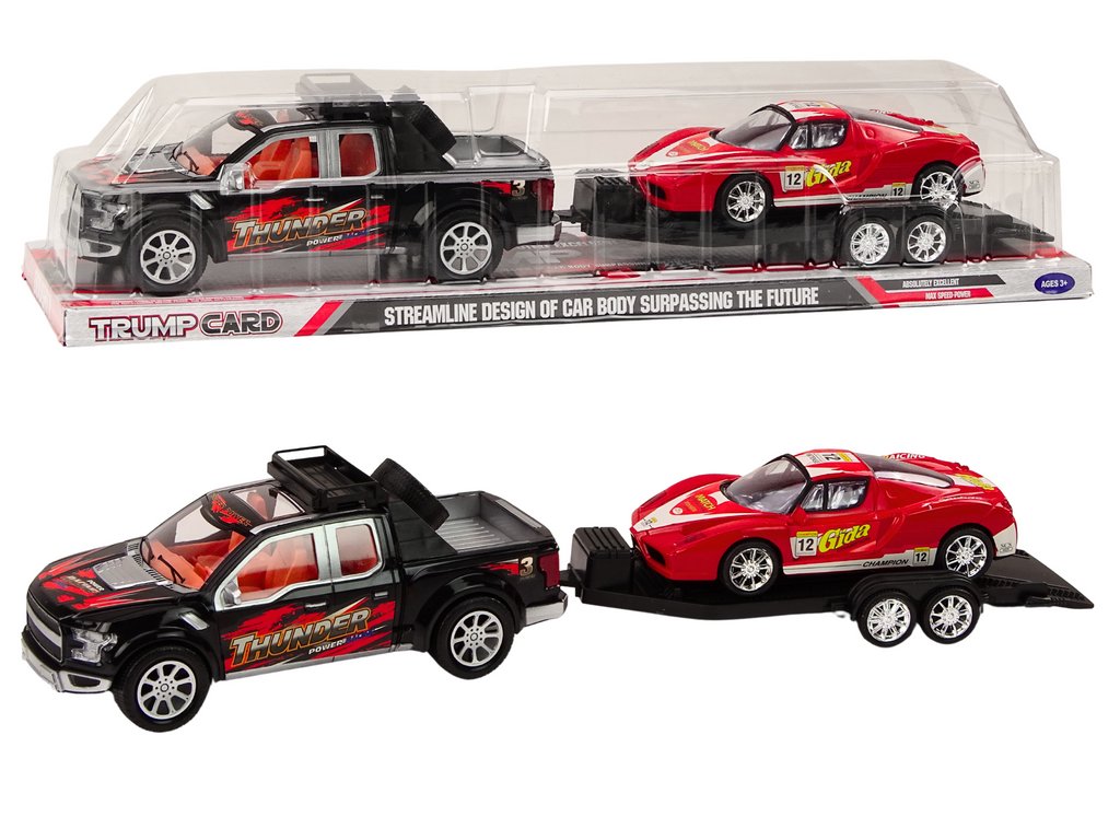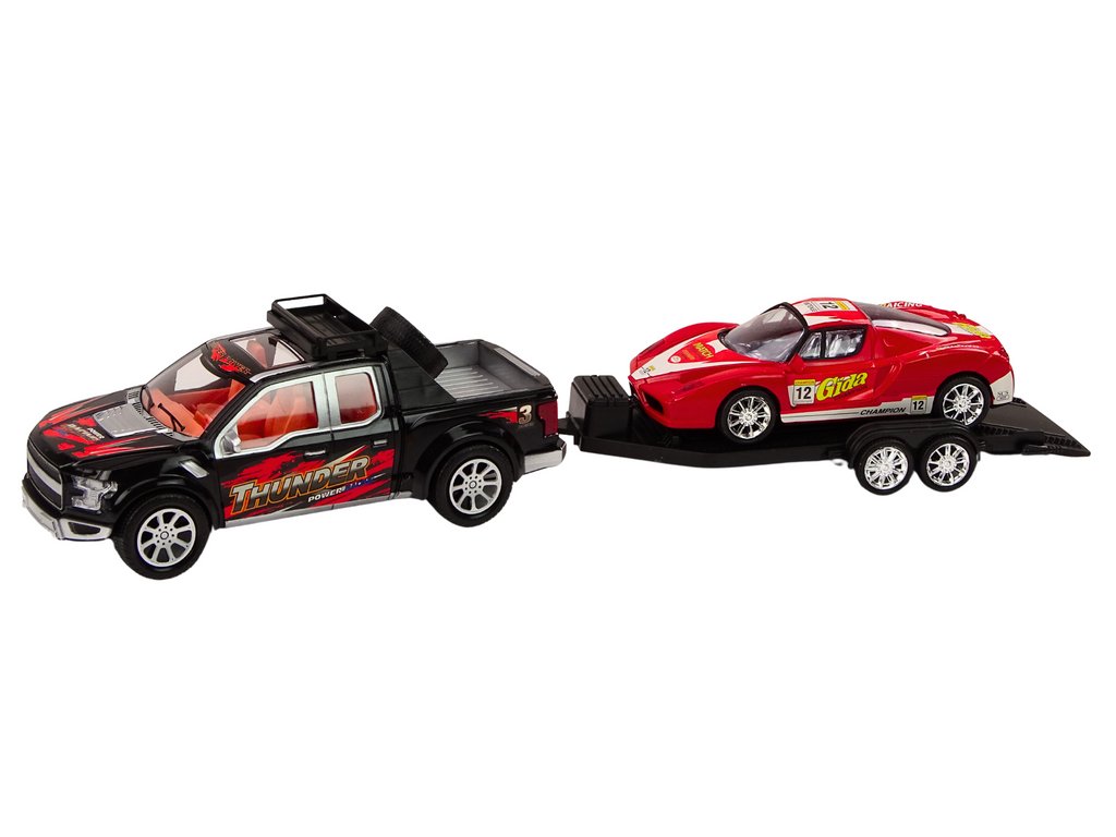 Zábavná sada auto pickup s přívěsem poskytne dětem hodiny radosti a zábavy. Sada se skládá z robustního pickupu a přívěsu, na kterém se nachází červené sportovní auto.