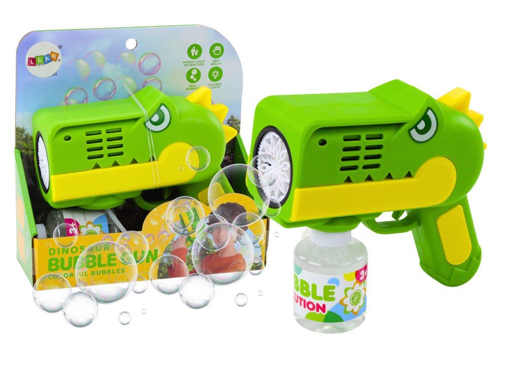 Tato pistole na bublinky je oblíbenou hračkou, která dětem přináší spoustu radosti. S atraktivním designem ve tvaru roztomilého dinosaura a v intenzivní zelené barvě stimuluje dětskou fantazii. Stačí stisknout tlačítko a pistole začne vytvářet barevné bublinky, což zajišťuje hodiny zábavy.