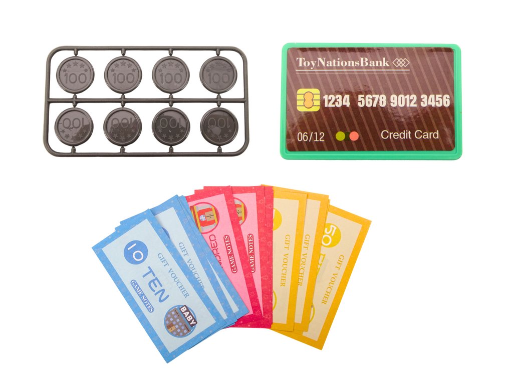 Aby byla hra co nejrealističtější, jsou do sady přidány také bankovky, mince a kreditní karty. Díky těmto doplňkům mohou děti napodobovat skutečné platební transakce a současně se učit počítat peníze, což je výborná příležitost k praktickému rozvoji matematických dovedností.