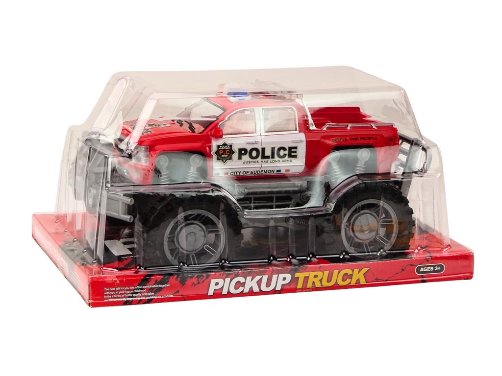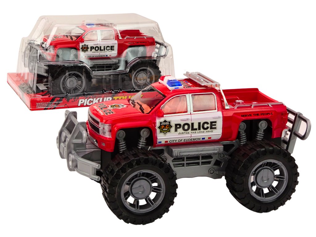 Vozidlo je vybaveno velkými černými terénními koly, které zajišťují vynikající přilnavost na různých površích a umožňují hru v náročnějších podmínkách. Karoserie automobilu je natřena na červeno a ozdobena nápisem „POLICE“, což mu dodává autentičnosti. Na střeše pak najdete policejní majáky, které zdůrazňují jeho funkci a vzhled.