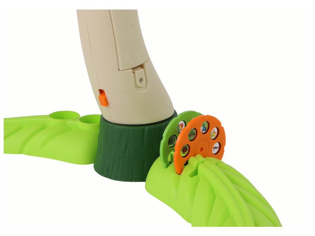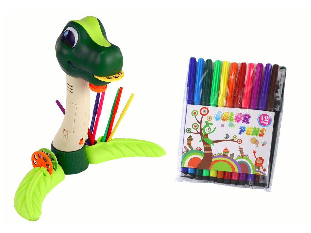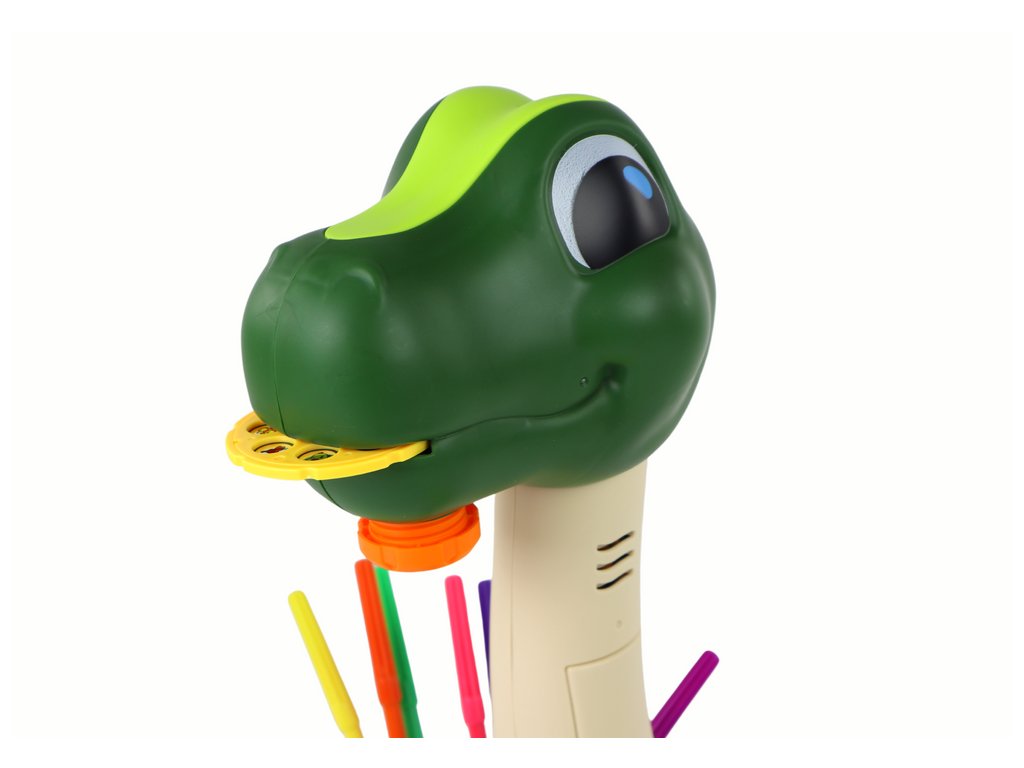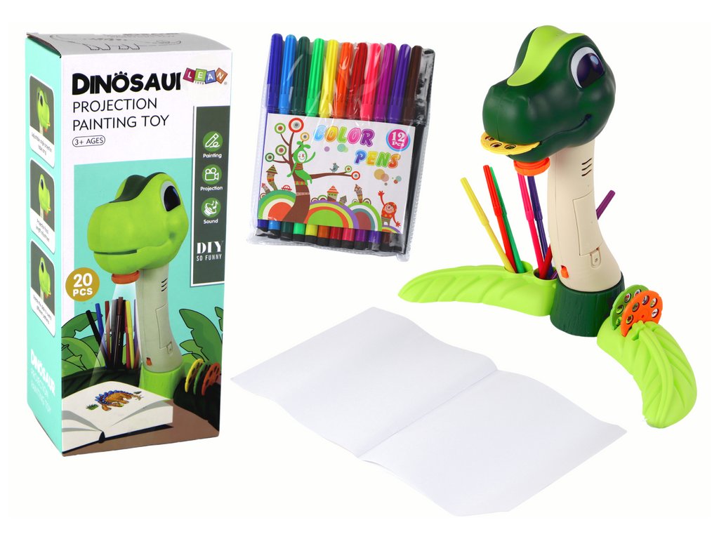 Projektor má roztomilý tvar dinosaura, který přitahuje pozornost dětí. Tím však jeho zábava nekončí – jeho hlava je pohyblivá, což umožňuje dětem přizpůsobit si výšku projekce svým potřebám a preferencím. Je vybaven i zvukovou funkcí, která dětem zpříjemní kreslení.