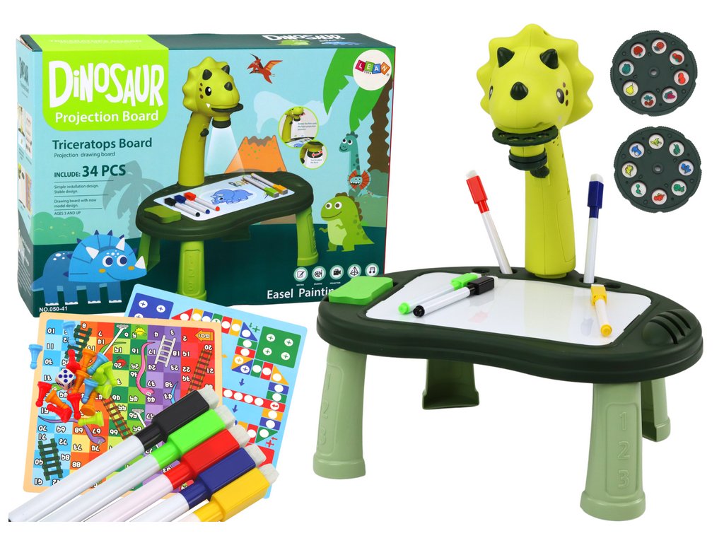 Projektor na kreslení Dinozaur Stůl Hry 2v1 Člověče, nezlob se a Hadi Zelený