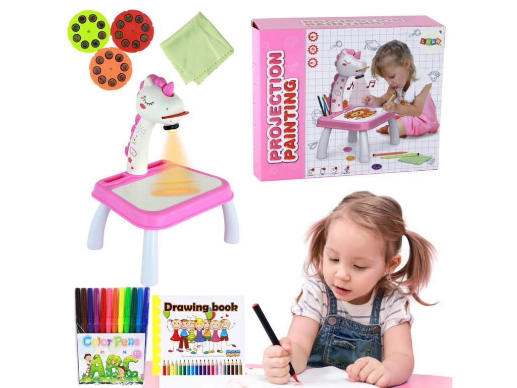 Projektor na kreslení Jednorožec s pastelkami a vložkami růžový