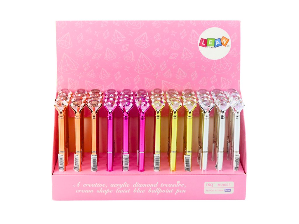 Tato jedinečná propiska spojuje styl a praktičnost, a díky ozdobě ve tvaru diamantu na svém konci působí elegantně a originálně. S modrým inkoustem, který zajišťuje hladké a plynulé psaní, se stává skvělým společníkem pro každodenní poznámky i výjimečné příležitosti. Ideální volba pro ty, kteří chtějí svým písemnostem dodat špetku elegance a osobitosti.