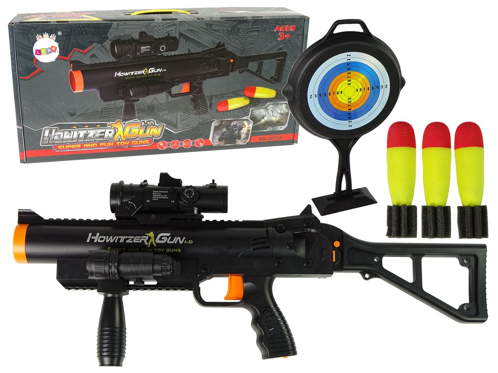 - Speciálně namontovaná pružina způsobí vystřelení spolu s realistickým zvukem výbuchu, opětovného nabití a série výstřelů. Náboje jsou zcela bezpečné, obklopené měkkou pěnou. Velký efekt udává dostřel výstřelu!