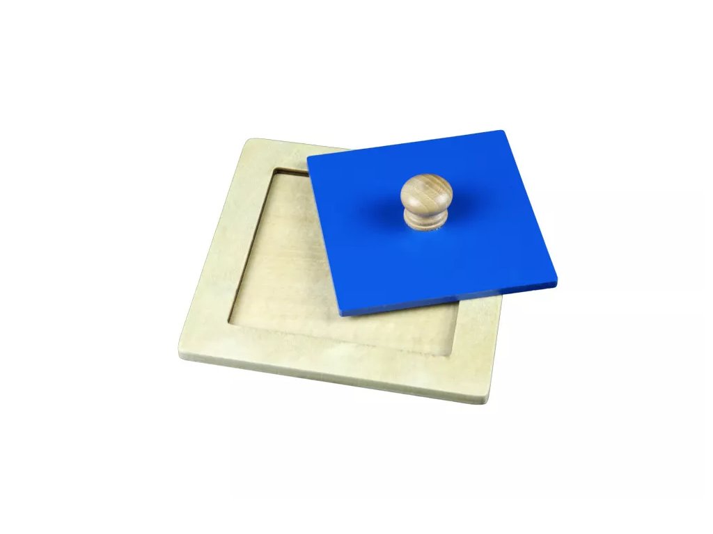 Montessori pomůcka určená pro nejmenší. Vyndavací geometrický tvar (čtverec) je umístěn na dřevěné desce a opatřen malou úchytkou ve středu modrého obrazce pro snadnější manipulaci.