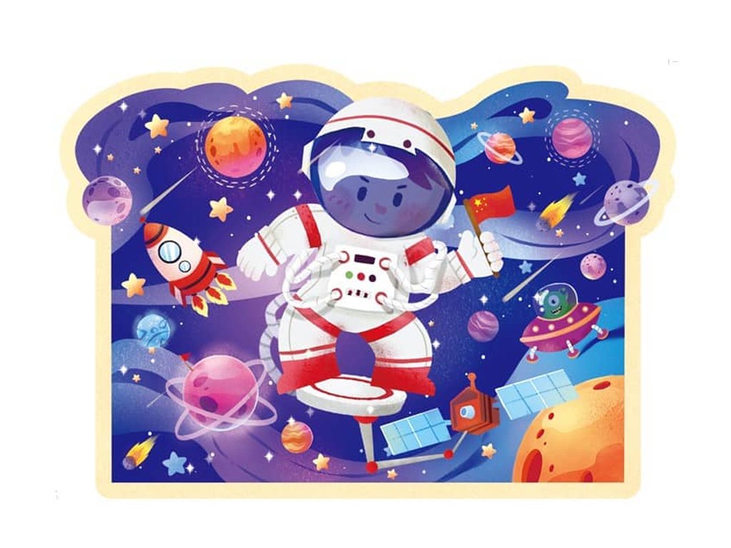Každý kousek skládačky je pečlivě vytvořený, aby padnul do malých rukou. Ilustrace zobrazují malého kosmonauta, který objevuje tajemství vesmíru obklopené planetami, raketou a satelitem.
