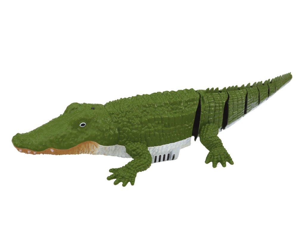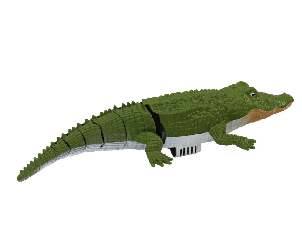 Krokodýl má zelenou barvu s jemnými bílými a hnědými prvky, což přidává na jeho realističnosti a napodobuje přirozené zbarvení skutečného krokodýla. Jeho ocas je pohyblivý, což přidává další dynamiku a realismus při pohybu ve vodě.