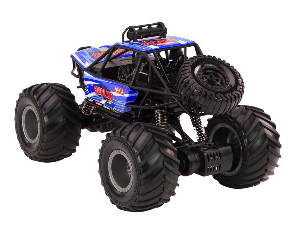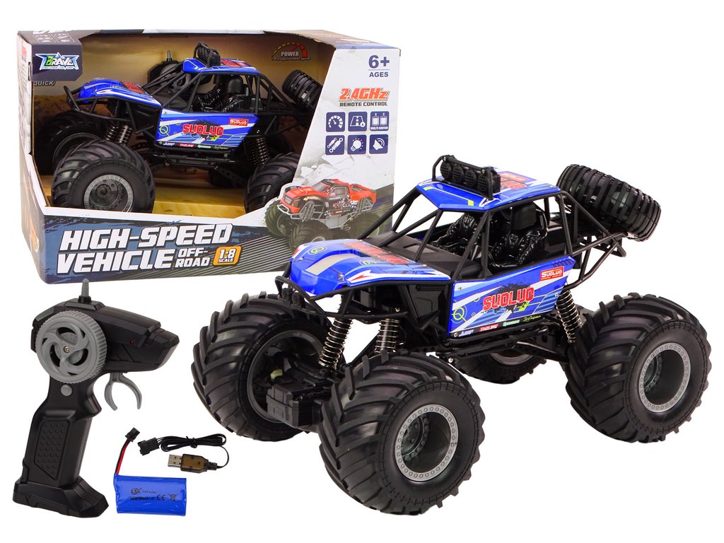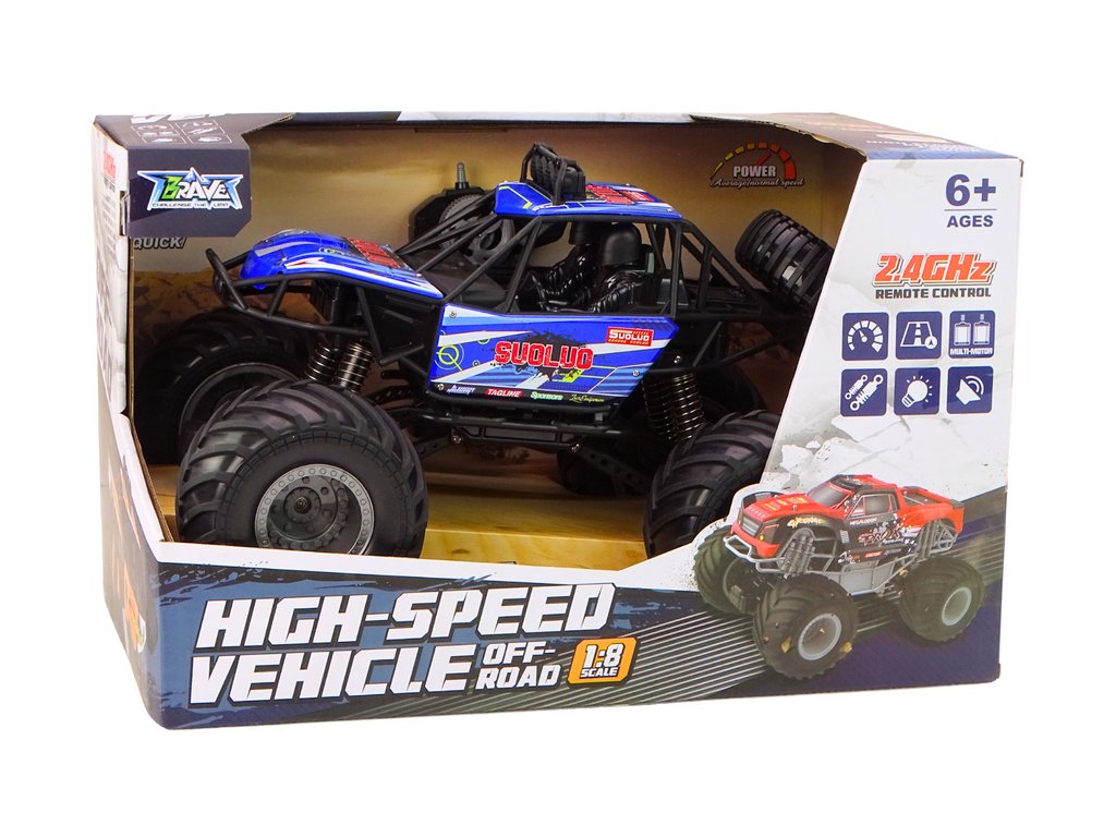 Terénní auto na dálkové ovládání v měřítku 1:8 je skutečná lahůdka pro mladé dobrodruhy. Vytvořené v intenzivní modré barvě, tyto neohrožené vozy přitahují pozornost na první pohled. Vybavené obrovskými, odolnými gumovými koly a pokročilými amortizéry, jsou připraveny čelit i těm nejtěžším terénům.
