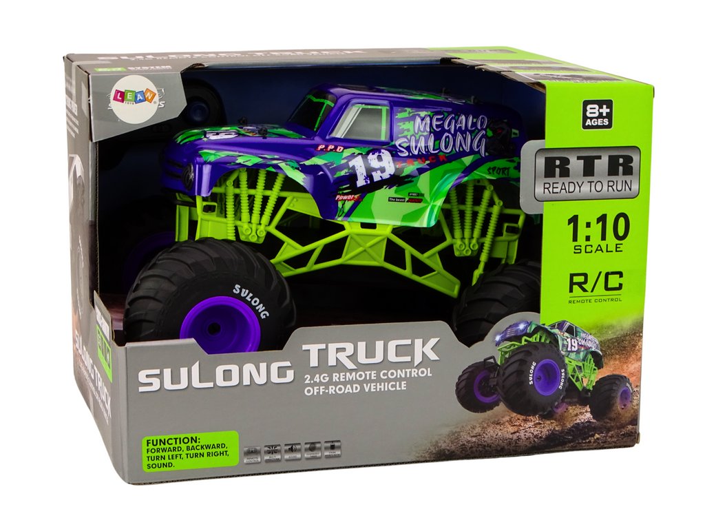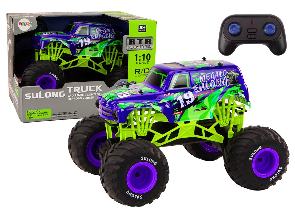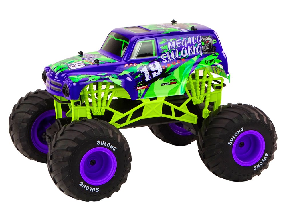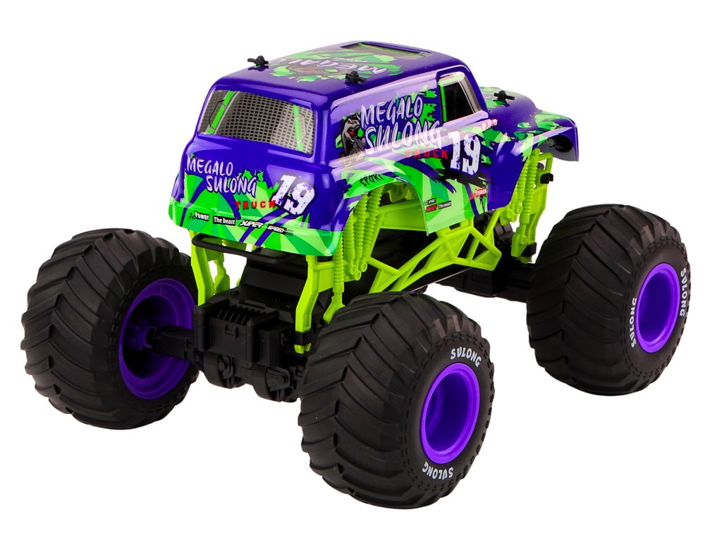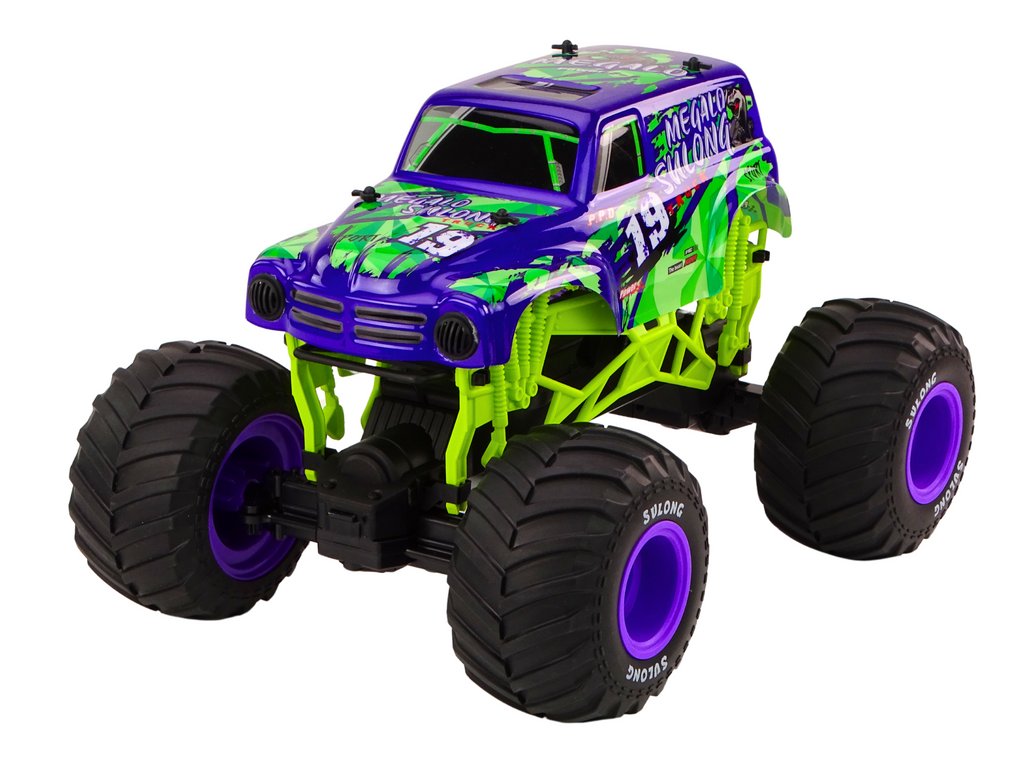 Terénní auto ve fialovo-zelené barvě je snem každého milovníka dálkově ovládaných vozidel. Postavené v měřítku 1:10, vypadá impozantně pro uživatele i diváky.