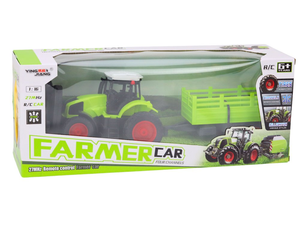Dálkově ovládaný traktor s přívěsem v měřítku 1:16 je ideální hračkou pro malé nadšence zemědělství a strojů. Traktor a přívěs fascinují svou realistickou přítomností, vyhotovenou v jasně zelených barvách, s důrazem na detaily, což je činí vizuálně velmi podobnými skutečným modelům.