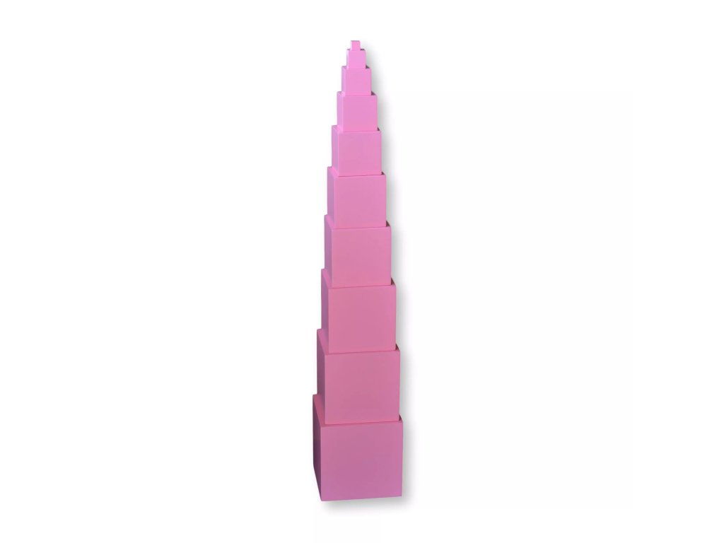 Smyslová Montessori pomůcka složená z 10 růžových dřevěných krychlí s hranami od 1 cm do 10 cm. Určena k vnímání rozměru ve třech dimenzích a k nepřímé přípravě na práci s matematickými pomůckami.
