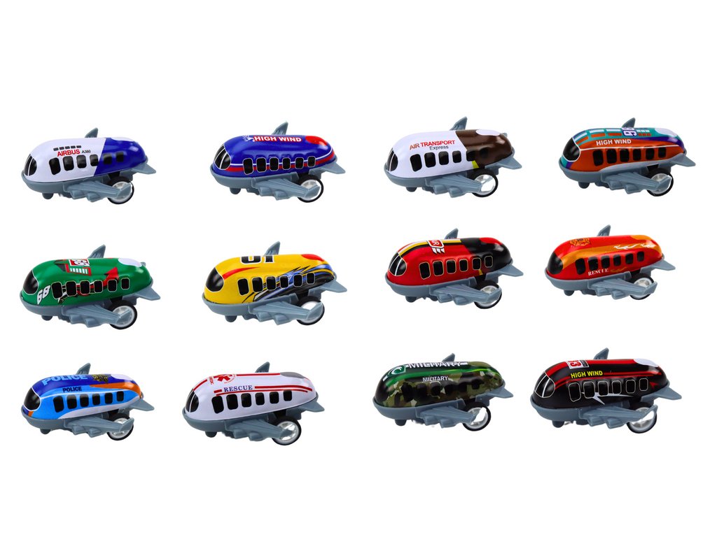 Sada 12 autíček ve tvaru letadel s pohonem, které jsou ideální pro mladé nadšence do letectví a techniky.