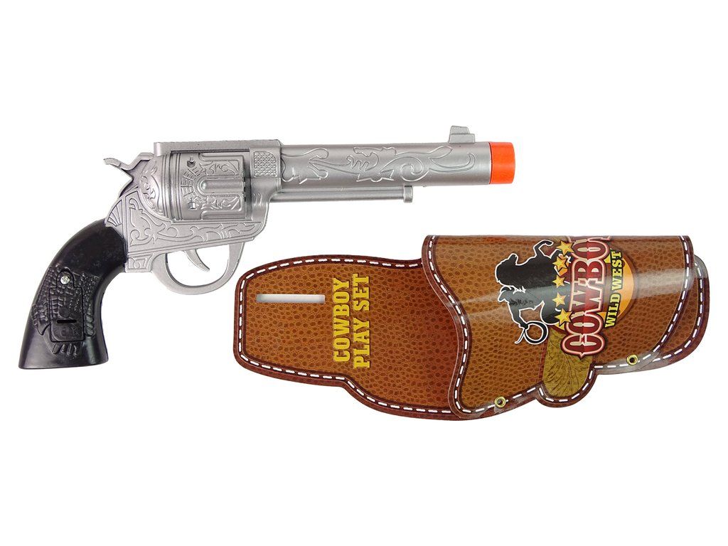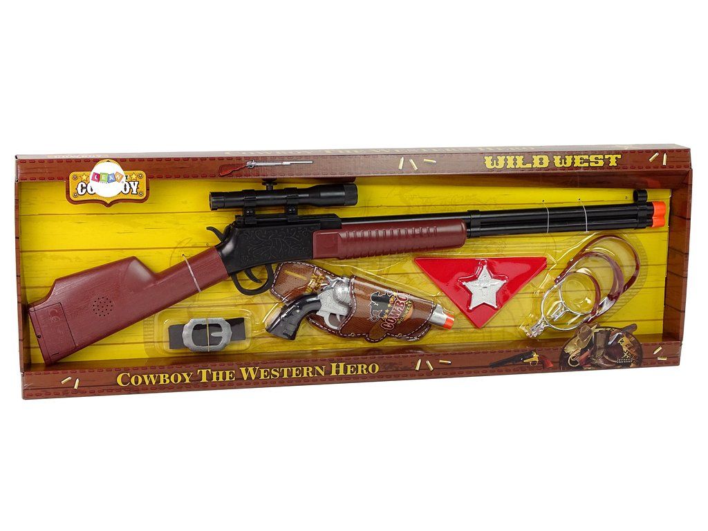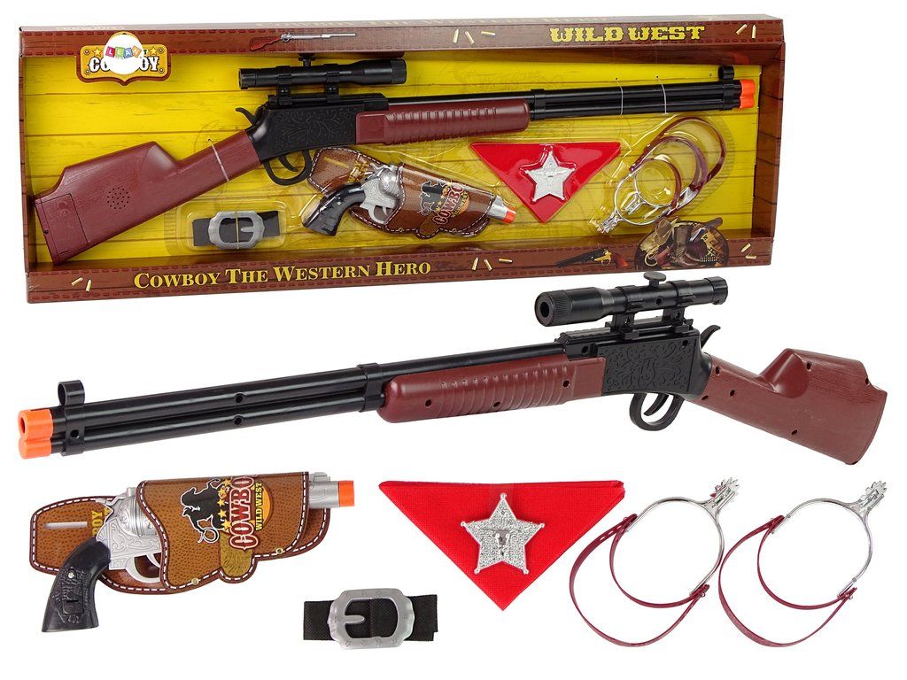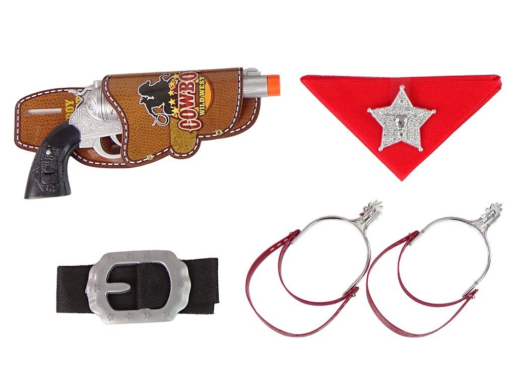 Malá pistole vydává zvuk jako skutečná, stiskněte spoušť a uslyšíte zvuk výstřelu. Velká brokovnice má značné rozměry, přes mířidla vidíte na cíl, střílíte velmi přesně a slyšíte zvuk výstřelu. Žádný zloděj vám neunikne! Doplňky dodají vážnost, vzbudí strach a promění vaše děťátko v texaského rangera. Ostruhy na boty, opasek a je čas na hraní!