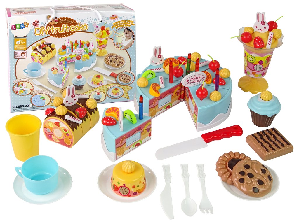 Sada obsahuje také spoustu dekorací v podobě pusinek, různého ovoce, svíček a topperů.