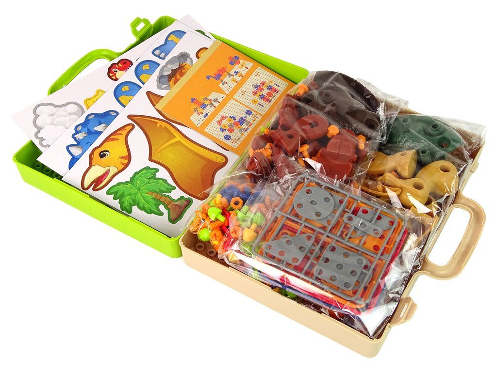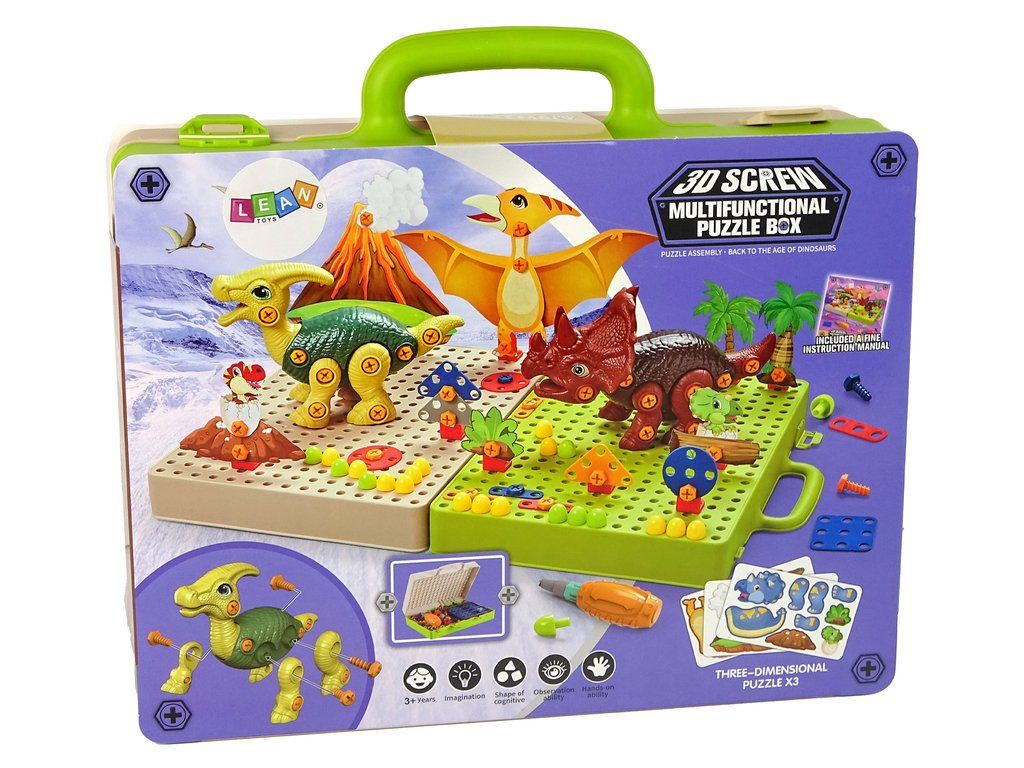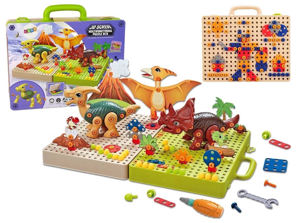 Celá sada obsahuje dva druhy dinosaurů k sestavení: velociraptor a tyranosaurus. Každý z nich se skládá z mnoha částí, úkolem tvého dítěte bude jejich sestavení pomocí šroubků a šroubováku. Kromě nich najdeme v setu desky vulkanu, stromy nebo jiné dinosaury, které doplní prostředí. To ale není vše!