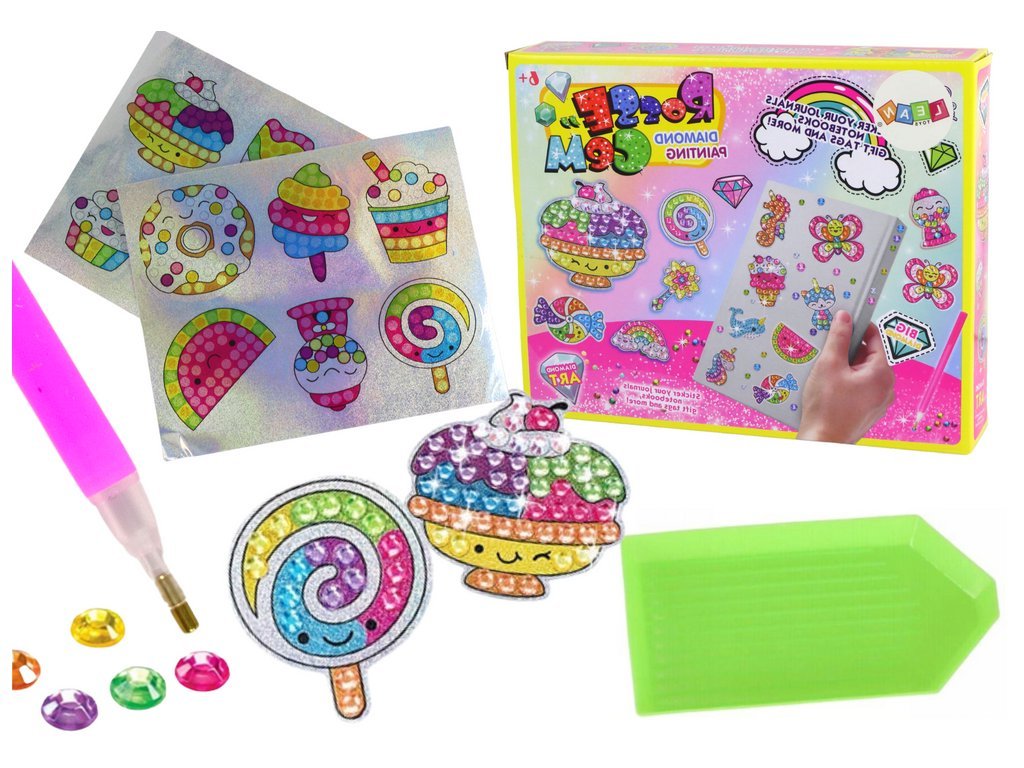 Tato sada s doplňky pro vytváření jedinečných nálepek je ideální pro nejmenší tvůrce. Inovativní technika lepení diamantů umožňuje vytvářet krásné obrázky přilepením malých diamantů na nálepky s roztomilými motivy sladkostí, které jsou součástí této sady.