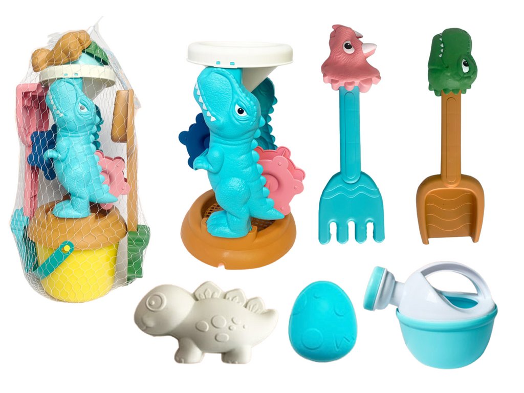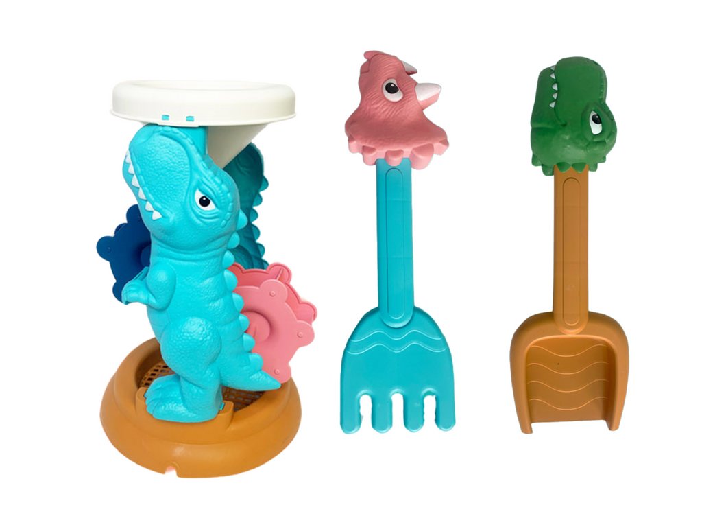 Sada hraček na písek je ideální způsob, jak kreativně trávit čas na pláži nebo v pískovišti. Hlavním prvkem sady je mlýnek s motivem dinosaurů, který slouží jako trychtýř a sítko. Děti tak mohou prosívat písek nebo vodu, vytvářet fascinující efekty a zároveň objevovat svět dinosaurů.